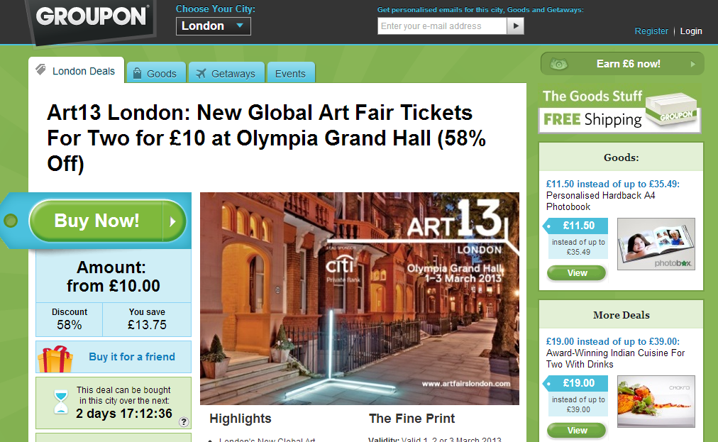 Groupon is the most comprehensive, established, best known UK group buying website. Each day they deliver you the hand picked deals and discount of over 70%.